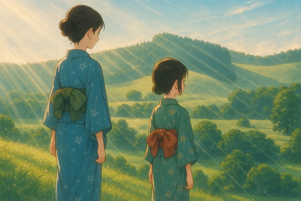 十勝ポロシリ岳の裾野に広がる緑の絨毯の上で、着物姿の姉妹が静かに佇んでいます... -