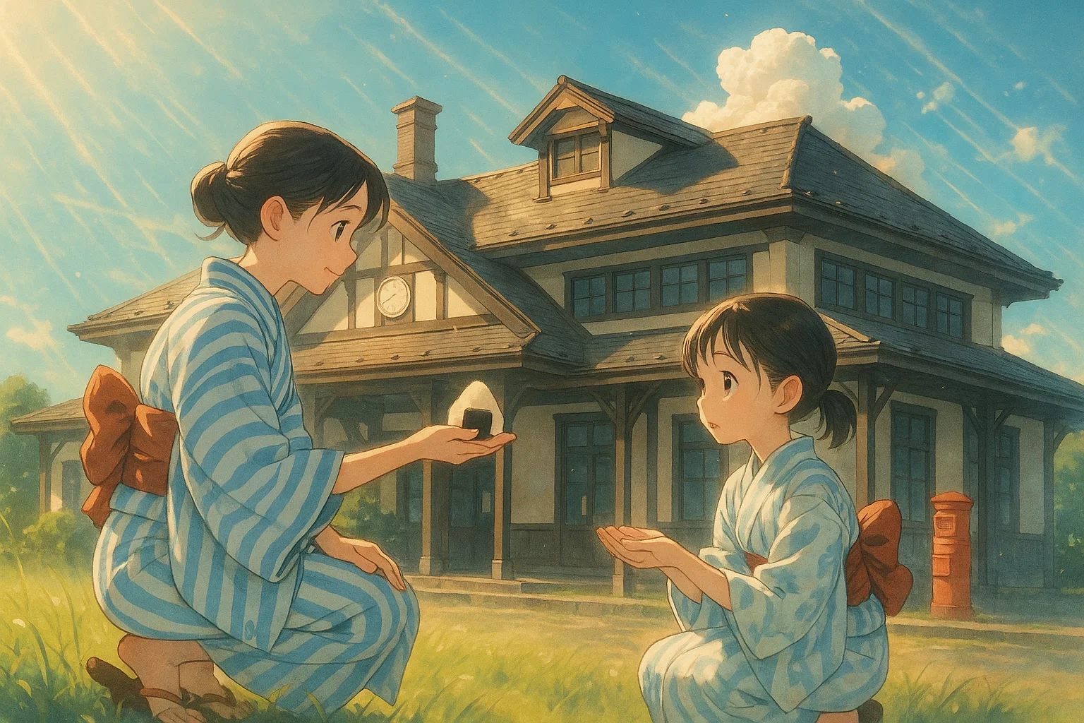 木造の平屋にぶらさがる、ひとつの風鈴。音は鳴っていないのに、聞こえた気がした。 彼はまっすぐ前を向いていた。彼女は少しだけ、振り返っていた。二人の間には、言葉ではない何かが、確かに通っていた。 この道は、何度も一緒に歩いたはずなのに。今日...